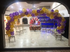 Prior to even leaving the USA for Peru we had already known this was part of the plan, so some of us brought party supplies with us, including a kit to make a big purple-and-gold balloon arch. Some of the local women bought party supplies at a store, then we spoke to Sylvia, the manager of our hotel, to borrow a large meeting-hall, which we subsequently decorated with all kinds of party supplies. The women didn’t typically go to one of the main city plazas until around or 9 pm, so it was going to be a late night, but we pre-planned for that as well.